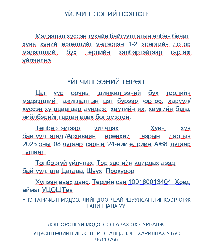 Байгаль орчин, ус цаг уурын мэдээллийн архивын үйлчилгээний үнэ тариф